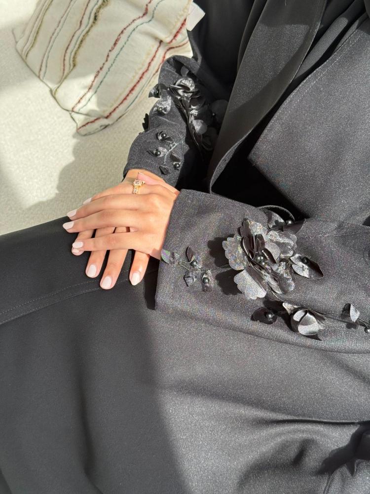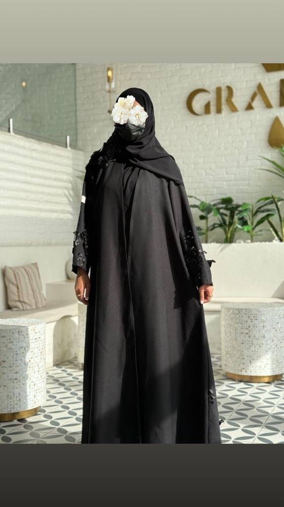 عباية بقماش كريب مينميت ودانيل مورد بورود كبيره بتصميم انيق مناسب للمناسبات